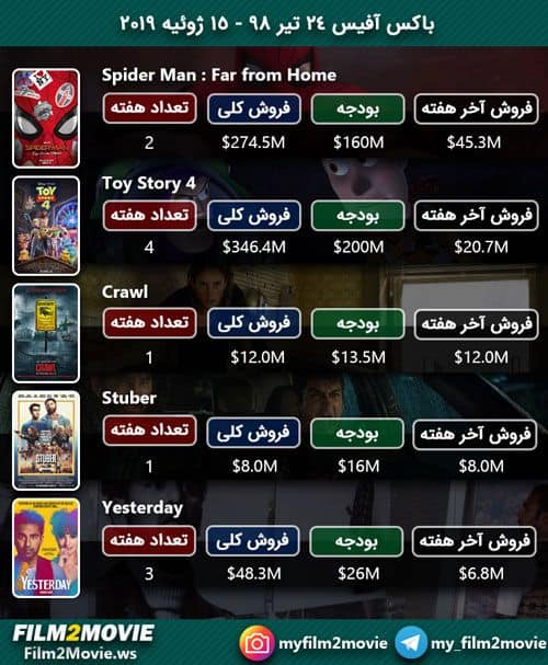 این هفته برای جایگاههای اول و دوم جدول باکسآفیس همانند هفته گذشته تکرار شد؛ «اسپایدرمن: به دور از خانه» (Spider-Man: Far from Home) صدرنشینی خود را حفظ کرد و در عین حال فروش جهانیاش را به رقم ۸۵۰ میلیون دلار رساند و «داستان اسباب بازی ۴» (Toy Story 4) هم درحالی جایگاه دوم را ازآن خود کرد که پنجمین اثر پرفروش پیکسار در سینماهای آمریکای شمالی شد. آثار جدیدی نیز در هفته اخیر بهروی پرده رفتند که از آنهای میتوان به فیلم «خزنده» (Crawl) اشاره کرد؛ فیلمی که در هفته اول اکران توانست جایگاه سوم را به خود اختصاص دهد. از آنطرف «استوبر» (Stuber) رو شاهد هستیم که با فروش افتتاحیه قابل قبولش در جایگاه چهارم قرار گرفت. جدیدترین اثر دنیای سینمایی مارول که توسط کمپانی سونی پیکچرز به اکران درآمد، «اسپایدرمن به دور از خانه» نه تنها با فروش خانگی ۴۵٫۳ میلیون دلاری اش در هفته اخیر صدرنشینی و مقام خود در جدول باکسآفیس را حفظ کرد بلکه تنوانست مجموع فروش خود در سینماهای آمریکای شمالی را پس از دو هفته به رقم ۲۷۵ میلیون دلار برساند. با اضافه شدن فروش خارجی ۱۰۰ میلیون دلاری نیز فروش جهانی این فیلم ابرقهرمانی به رقم ۸۵۰ میلیون دلار تنها در ۱۷ روز رسیده است. با عبور از قسمت سوم مجموعه «اسپایدرمن» سم ریمی این فیلم توانست با مجموع فروش خارجی ۵۷۲٫۵ میلیون دلاری خود بیشترین فروش خارجی را در بین آثار مجموعه «اسپایدرمن» از ابتدا تا به امروز داشته باشد و این رکورد در هفتههای آینده افزایش خواهد کرد. چین با فروش ۱۹۱٫۸ میلیون دلاری خود بیشترین فروش خارجی این فیلم را به خود اختصاص داده و کشورهایی همچون کره جنوبی (۴۹٫۷ میلیون دلار)، بریتانیا (۲۸٫۶ میلیون دلار)، مکزیک (۲۴٫۱ میلیون دلار) و برزیل (۱۸ میلیون دلار) در جایگاههای بعدی قرار میگیرند.